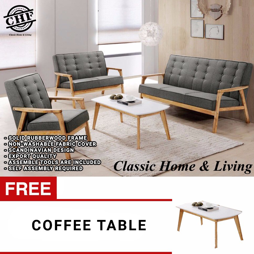 Chf Niki Wooden Sofa Set 1 2 3 Free Coffee Table Solid Wood Frame Thick And Comfortable Fabric Grey Color Shopee Malaysia